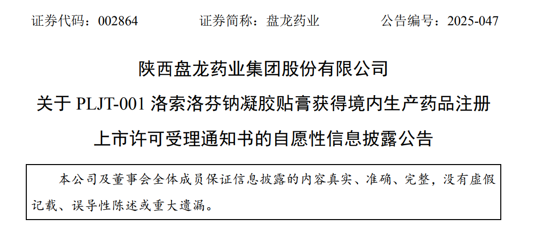 盤龍藥業(yè)PLJT-001洛索洛芬鈉凝膠貼膏上市申請獲受理,鎮(zhèn)痛新藥研發(fā)再提速